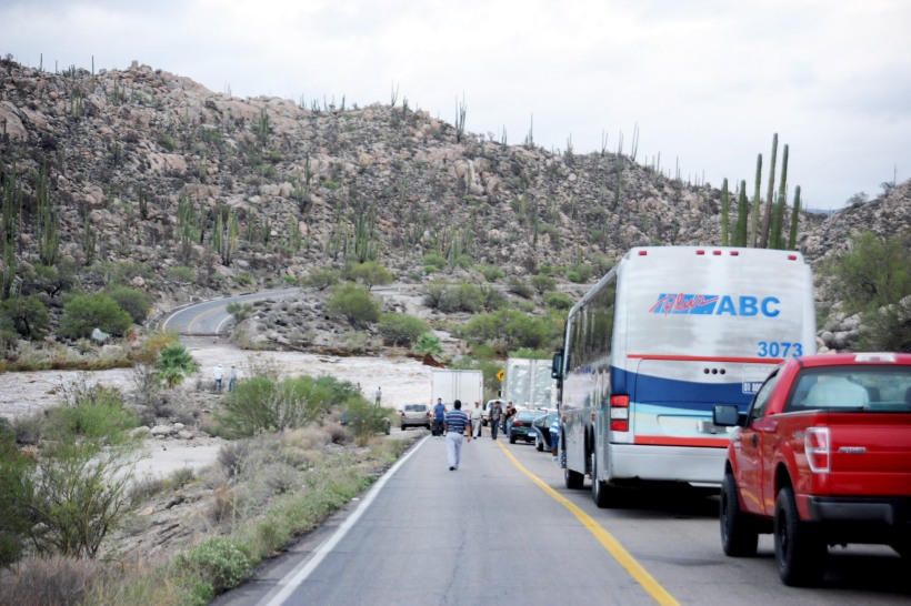 El paso de “Odile” por el territorio de Baja California desde el 15 hasta el 17 de septiembre, aun cuando ya había reducido su intensidad a tormenta tropical, dejó sin energía, sin agua e incomunicadas vía terrestre, a distintas comunidades de la zona sur del municipio de Ensenada, afectando a El Barril, Villa de Jesús María, y particularmente a Bahía de los Ángeles. Desde el martes 16 de septiembre, autoridades municipales se trasladaron hacia las zonas afectadas, luego del reporte de más de 60 viviendas dañadas en las costas del Golfo de California, en el poblado de Bahía de los Ángeles. El secretario general del Ayuntamiento de Ensenada, Jesús Jaime González Agúndez; el titular de la Dirección Municipal de Protección Civil, Arturo Granados González; así como personal de rescate y paramédicos, estuvieron recorriendo los sitios afectados el martes. Al día siguiente, el alcalde Gilberto Antonio Hirata Chico también acudió a esa delegación, con ayuda de la Secretaría de Marina Armada de México (SEMAR), quienes lo trasladaron en helicóptero hasta el poblado, junto con funcionarios del Gobierno del Estado, para la repartición de despensas por parte del DIF. Carreteras destrozadas, caminos inundados, postes caídos, un tractocamión volcado y daños en diversas estructuras, entre casas y comercios, se apreciaban en las primeras imágenes enviadas a la prensa. Algunas despensas fueron repartidas el miércoles, mientras el gobierno municipal anunció la instalación de tres centros de acopio en Ensenada, para quienes desearan apoyar a estas poblaciones incomunicadas. Agua y alimentos, son lo principal que requieren los residentes de Bahía de los Ángeles. Los centros de acopio quedaron instalados en las instalaciones del DIF Municipal de Ensenada, frente al edificio del Palacio Municipal y en la Segunda Región Naval de la SEMAR, ubicadas en el Bulevar Costero. Personal de Protección Civil Municipal anunció que la zona sur requería atención inmediata, aunque hasta el mediodía del miércoles 17 de septiembre no reportaban personas lesionadas, ni fallecimientos a causa de la paso de la tormenta. “Lo que sí tenemos es el corte de los caminos de acceso, donde la misma comunidad pues obviamente se va a ver en la necesidad de ser abastecida tanto de alimentos, agua”, adelantaba Protección Civil. “Requerimos ayuda de la comunidad”, “Hablando en números tenemos aproximadamente 60 casas dañadas, algunas con pérdidas totales”, expuso el director de Bomberos de Ensenada, Jaime Nieto de María y Campos. “Aproximadamente 350 personas (afectadas), sacando un promedio de familias. Estas personas acudieron con sus familiares, están albergadas con sus familiares. No hay luz, no hay servicio de luz en la comunidad. No hay agua tampoco. La situación de los víveres también está un poquito complicada por los cortes de caminos que tenemos”, explicó. El primer punto, en el que hasta el miércoles se podía llegar vía terrestre, era uno de los arroyos ubicados en Cataviña, al sur de El Mármol, una zona montañosa donde se registró la crecida de varios arroyos en diversos puntos. Decenas de automovilistas quedaron a la espera de que bajara la intensidad de las corrientes que movían grandes cantidades de arena, roca y ramas de árboles. Ahí en Cataviña, los conductores bajaban de sus vehículos a observar el paso del agua. “¿A dónde va?”, se le preguntó a uno de los conductores. “A Villa Jesús María, que les llovió mucho por allá”, respondió mientras veía hacia el arroyo. Varias personas caminaban con sus maletas sobre la carretera. El autobús en el que viajaban se regresaría hacia la ciudad de Ensenada, y los pasajeros se subirían a otro autobús ubicado metros enfrente. Ahí esperarían que se reanudara la circulación por la carretera. En otro sitio, un residente de San Diego, California, preguntaba qué tan profundo era el arroyo. Había viajado cerca de diez horas y necesitaba llegar a Bahía de los Ángeles, tenía una casa allá con un refrigerador lleno de comida. Le habían avisado que no había luz en el poblado, y seguramente todo terminaría echándose a perder. Sin embargo, al no poder pasar, dijo que regresaría. Esperaría a que mejoraran las condiciones. Además del arroyo en Cataviña, en al menos otros dos puntos de la carretera, antes de llegar hasta Bahía de Los Ángeles, el cruce no era posible. Lo más grave, apuntaron las autoridades, “que no hay energía, que no hay agua”. La SEMAR les adelantó que tendrían disposición de trasladar los víveres colectados en los centros de acopio, incluyendo el de la misma Segunda Región Naval, hacia los lugares afectados. Bahía de los Ángeles, advirtió el director de Bomberos, “será declarada zona de desastre”. Con ello, el gobierno municipal podrá acceder a recursos del Fondo Nacional para Desastres Naturales (FONDEN). Asimismo, mencionó que unidades del Ayuntamiento se trasladaban desde el miércoles al poblado con plantas generadoras de energía eléctrica, “con la idea de reestablecer hoy mismo por la noche el servicio de energía”, dijo. De igual forma, el reabastecimiento de agua estaba siendo atendido por la Comisión Estatal de Servicios Públicos de Ensenada (CESPE) y había maquinaria de la zona, que estaba siendo trasladada para ayudar a limpiar las calles. Hasta el jueves 18 de septiembre, el Comité Municipal de Protección Civil se mantenía en sesión permanente, con todas las mesas activas en el Ayuntamiento. Y en lo que respecta a las carreteras federales, al menos a lo largo de la noche del martes 16 y la mañana del miércoles 17 de septiembre, ni una sola patrulla de la Policía Federal, ni elementos municipales, fueron observados brindando algún tipo de ayuda a los conductores, ni patrullando la transpeninsular. Únicamente se mantuvieron los puestos de revisión regulares de la Secretaría de la Defensa Nacional, con militare