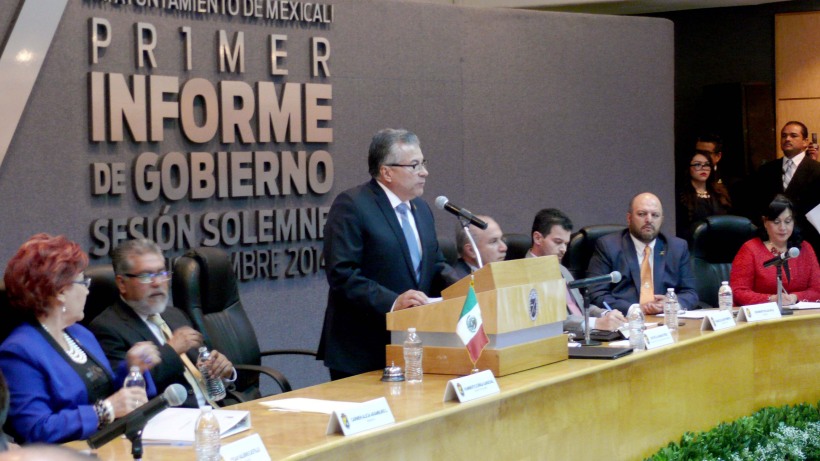 Empujado por la mala situación económica, Jaime Díaz Ochoa, alcalde de Mexicali, presentó su Primer Informe de Gobierno ante el Cabildo de Mexicali, en una abstinente ceremonia. El lunes 24 de noviembre se abandonó el derroche y las tradicionales ceremonias en los grandes espacios. El Informe regresó a su lugar de origen, el Palacio Municipal, concretamente, la Sala del Cabildo. Desde temprano se dieron cita cerca de 160 invitados. En primera fila, la oficial mayor, Maribel Avilés; junto a la titular de la Secretaría Particular -y pareja sentimental del alcalde-, Sonia Carrillo, el representante de la II Región Militar, Francisco González Loaiza; además de un representante por el Poder Judicial, Gustavo Medina. Posteriormente se integró el gobernador del Estado de Baja California, Francisco Vega. En su corto discurso -de apenas cinco cuartillas-, Díaz Ochoa expuso que durante su gobierno ha enfrentado una serie dificultades, como la “catastrófica situación financiera”, a la que además caracterizó como “sin precedente” en la historia de la administración municipal. Según el alcalde, se concentró en un plan de saneamiento de las finanzas públicas que incluye el tema de ingresos, mayor control y eficacia en la recaudación de los ingresos propios. En la parte de los egresos, dijo que se ha implementado un estricto control presupuestal, como la eliminación de pagos de servicios de teléfonos celulares, radios de comunicación y ahorro en combustibles. Al igual que hace un año, en su toma de posesión, Díaz Ochoa mencionó los ejes de su gobierno, entre el desarrollo económico, social, ambiental, seguridad pública e infraestructura, todo con cifras de eventos, alcances, logros y atenciones a ciudadanos del Valle y la ciudad. “Pueden estar seguros que en los próximos 24 meses que restan, trabajaremos incansablemente por recuperar ese Mexicali seguro, ordenado y limpio que sin duda merecemos”, prometió. En el protocolo se incluyó la participación de regidores de las diversas fuerzas políticas, primero Job Montoya por el Movimiento Ciudadano, luego Mayra Flores por el Partido Encuentro Social, Alejandro Gudiño por el Partido Verde Ecologista de México, Eugenio Núñez por el Estatal de Baja California y Efraín Montreal por Partido Nueva Alianza. Todos casi en un mismo sentido: tibias las críticas, complacientes y sin señalamientos. Para fijar posicionamiento, el Partido Revolucionario Institucional no eligió a ningún edil, lo hizo el síndico social y ex tesorero en la anterior administración municipal, Francisco Fimbres. El priista acometió: “Este primer año de gestión ha sido sumamente difícil, fueron muchas las promesas que usted realizó en campaña, pero poco se ha visto en los hechos”. El ex funcionario de Tejada admitió que aún faltan dos años de trabajo, “pero si por las vísperas se conoce el santo, hay pocas razones por conservar el optimismo”. Fimbres enumeró los temas que catalogó como preocupantes: la rotación de funcionarios, el enfrentamiento con el Cabildo, el desmantelamiento de proyectos sustentables y el incremento en la criminalidad. Además, el líder de los priistas consideró que no bastaban los cinco minutos de su espacio para incluir todas las deficiencias, como la falta de transparencia, el transporte público, los derechos de los manifestantes, bomberos, Sindicatura Social, la delegación Progreso y el desacato a la decisión de la Suprema Corte de Justicia en torno al matrimonio entre personas del mismo sexo. Fimbres reiteró al presidente municipal que se siguen esperando resultados y que el tiempo para pretextos se ha agotado, bajo la referencia de que “nunca segundas partes fueron mejores”, afirmó al explicar “la ausencia de los mejores días, que tanto pregonó en campaña”.