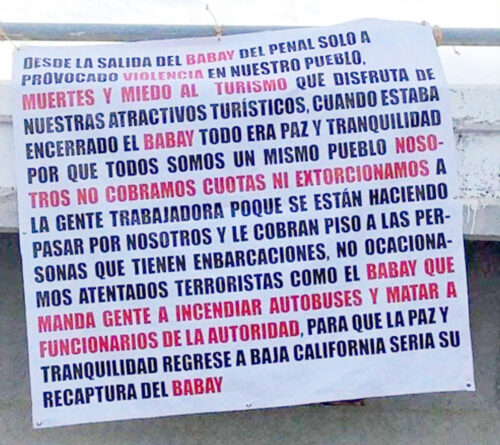 “DESDE LA SALIDA DEL BABAY DEL PENAL SÓLO A PROVOCADO VIOLENCIA EN NUESTRO PUEBLO, MUERTES Y MIEDO AL TURISMO QUE DISFRUTA DE NUESTROS ATRACTIVOS TURÍSTICOS, CUANDO ESTABA ENCERRADO EL BABAY TODO ERA PAZ Y TRANQUILIDAD POR QUE TODOS SOMOS UN MISMO PUEBLO NOSOTROS NO COBRAMOS CUOTAS NI EXTORCIONAMOS A LA GENTE TRABAJADORA POQUE SE ESTÁN HACIENDO PASAR POR NOSOTROS Y LE COBRAN PISO A LAS PERSONAS QUE TIENEN ENBARCACIONES, NO OCACIONAMOS ATENTADOS TERRORISTAS COMO EL BABAY QUE MANDA GENTE A INCENDIAR AUTOBUSES Y MATAR A FUNCIONARIOS DE LA AUTORIDAD, PARA QUE LA PAZ Y TRANQUILIDAD REGRESE A BAJA CALIFORNIA SERIA SU RECAPTURA DEL BABAY” [sic], señala la narcomanta.