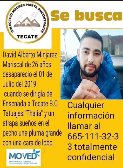 David Alberto Minjarez Mariscal, de 26 años, desapareció el 1 de julio del 2019 cuando se trasladaba en su automóvil sobre la carretera Tecate Ensenada, en un tramo entre la delegación de la Nueva Colonia Hindú y el poblado de Valle de las Palmas, donde fue interceptado por sujetos a bordo de dos vehículos, señalaron entonces testigos residentes del lugar. El joven se dirigía a su casa luego de pasar la noche en Ensenada; al no comunicarse con el paso de las horas, su madre Mónica Gabriela Mariscal inició su búsqueda en instituciones médicas, comandancias, amigos, conocidos, e incluso buscó acercarse a lideres criminales para solicitarles, con el clamor de una madre, información de su hijo; esa búsqueda duró seis largos años.