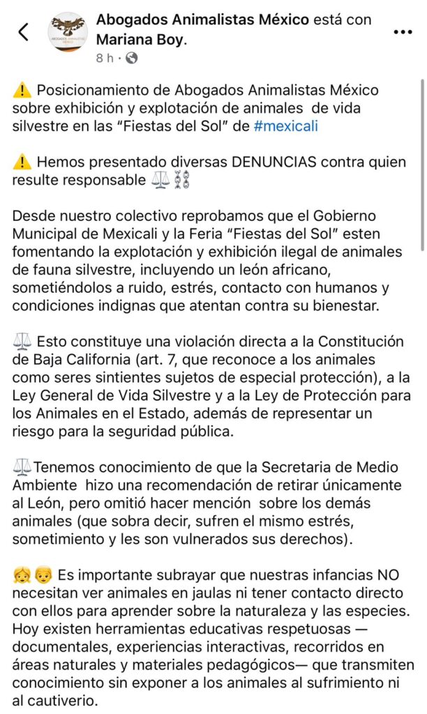 Mediante una publicación en redes sociales, la asociación fijó su postura respecto a la exhibición y presunta explotación de animales silvestres en la feria, luego de que se difundiera un video en el que se observa a un león africano actuando de forma nerviosa dentro de una jaula ubicada en el recinto.