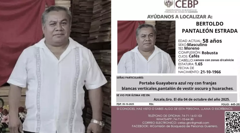 El sacerdote católico Bertoldo Pantaleón Estrada, quien fue reportado como desaparecido el 4 de octubre de 2025, fue hallado muerto el día 6 del mismo mes y año, en el Municipio de Eduardo Neri, en Guerrero, según informó la Fiscalía General del Estado (FGE).