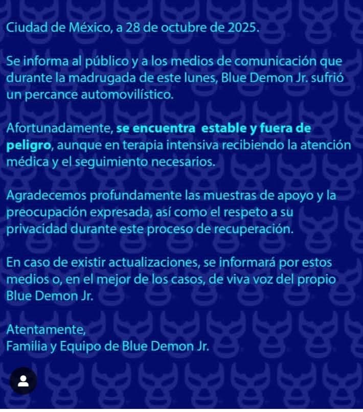 La leyenda de la Lucha Libre Blue Demon Junior dio a conocer a través de sus redes sociales que en la madrugada del pasado lunes 27 de octubre del 2025, tuvo un accidente automovilístico.