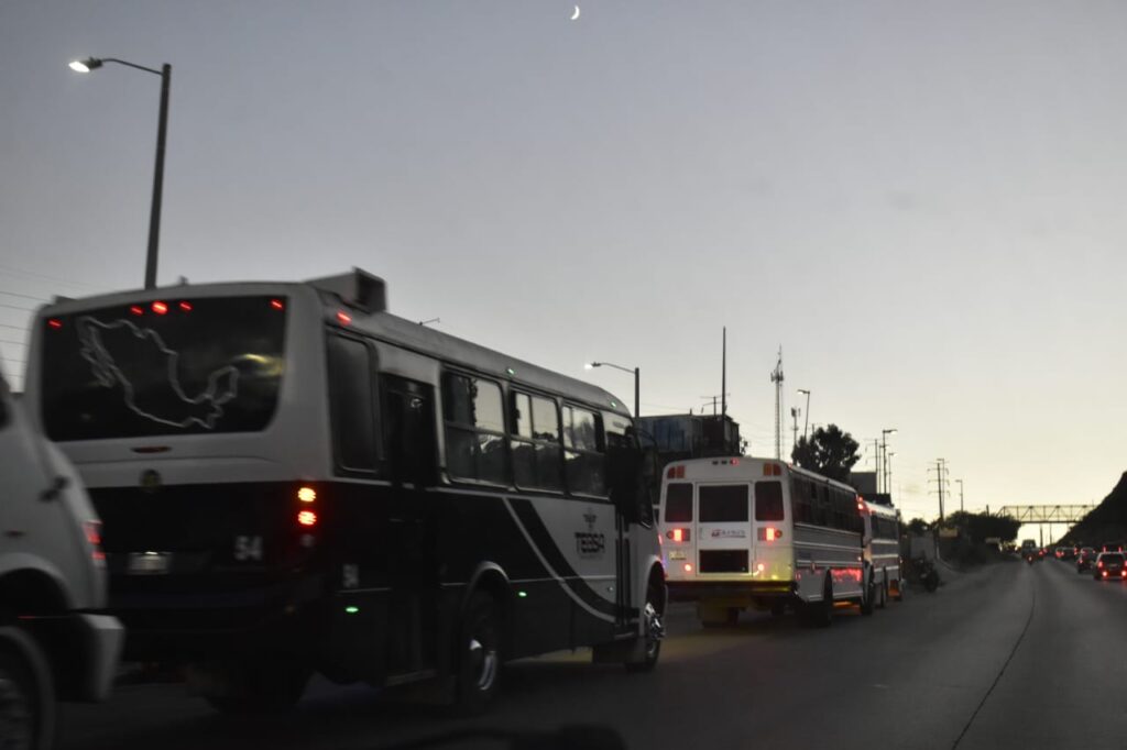 Numerosas personas arribaron al evento en unidades de transporte; al finalizar el acto decenas de camiones, estaban estacionados con las luces encendidas, por ambos lados del inmueble, en el libramiento Rosas Magallón.
