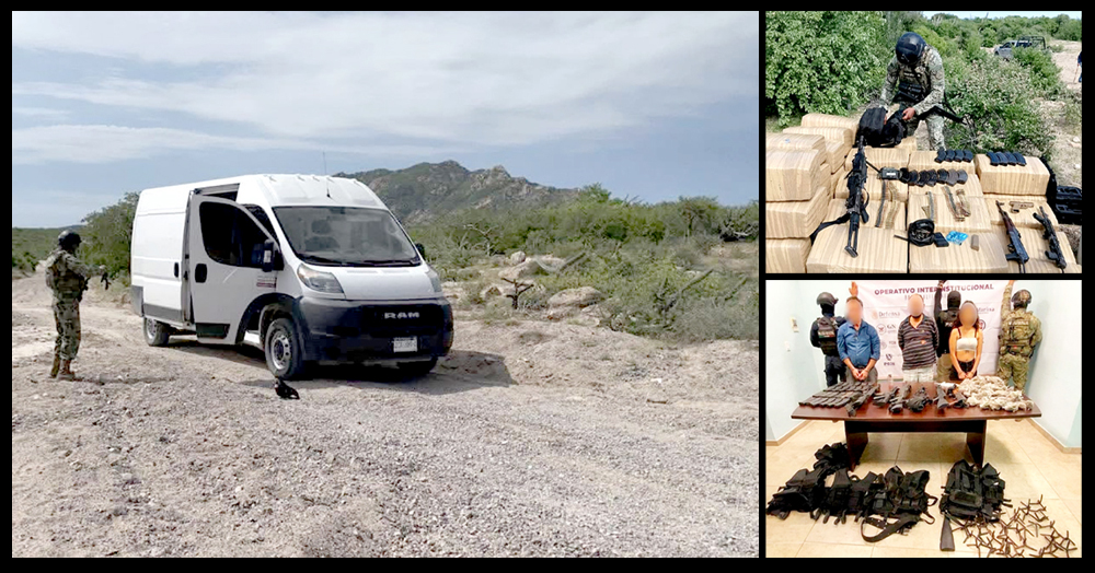 A los detenidos se les aseguró un arsenal, dosis de droga y vehículos en los que se movían en Comondú y Loreto consistente en ocho armas largas, un arma corta, 70 cargadores, 14 radios de comunicación, cuatro granadas de humo, uno de fragmentación, cinco bolsas conteniendo un material blanco y granulado, 11 bolsas conteniendo al parecer marihuana, nueve chalecos tácticos, dos placas balísticas, cinco fornituras, así como dos unidades de color blanco, una Silverado Chevrolet 2021 y una Ram 1500.