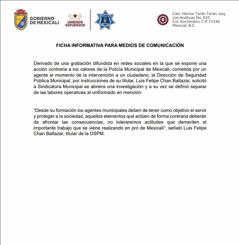 “Derivado de una grabación difundida en redes sociales en la que se expone una acción contraria a los valores de la policía municipal de Mexicali, cometida por un agente al momento de la intervención a un ciudadano, la Dirección de Seguridad Pública Municipal solicitó a Sindicatura Municipal que se abriera una investigación y, a su vez, se definió separar de las labores operativas al uniformado”.