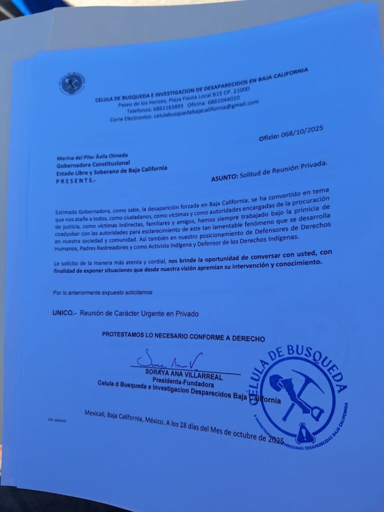 La Célula de Búsqueda e Investigación de Desaparecidos en Baja California entregó un oficio a la gobernadora del estado, Marina del Pilar Ávila Olmeda, y a la fiscal general, María Elena Andrade Ramírez, con el propósito de sostener una reunión con los integrantes del grupo.