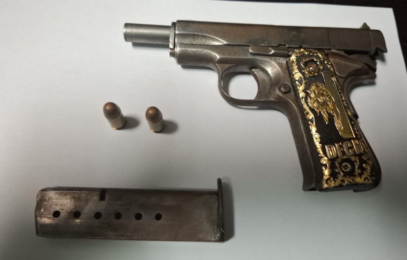 Luego del testimonio de la víctima, se desplegó un operativo de seguridad por la zona, logrando la detención del señalado, mismo que portaba un arma de fuego tipo pistola escuadra calibre .380 milímetros, así como un cargador abastecido con dos cartuchos útiles.