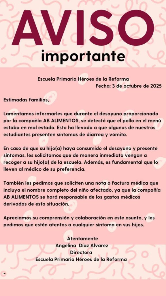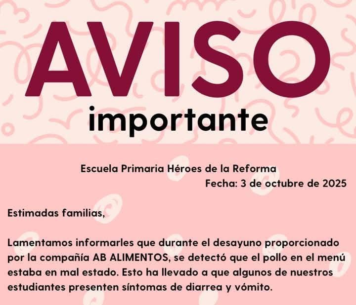 De momento solo se han confirmado oficialmente intoxicaciones en estas dos escuelas, sin embargo, a través de un comunicado personal directivo de la Escuela Primaria Héroes de Reforma, informó que el desayuno proporcionado por la compañía AB ALIMENTOS, se detectó que el pollo en el menú estaba en mal estado, lo que llevó a que varios estudiantes presentaran síntomas de diarrea y vómito, por lo que pidieron estar atentos ante los síntomas, así como pedir una factura médica que incluya el nombre completo del menor afectado, pues la compañía se hará responsable de los gastos médicos.