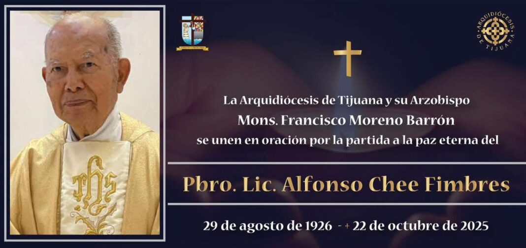 La Arquidiócesis de Tijuana informó sobre el fallecimiento del padre Alfonso Chee Fimbres, ocurrido el pasado miércoles 22 de octubre, a los 99 años de edad.