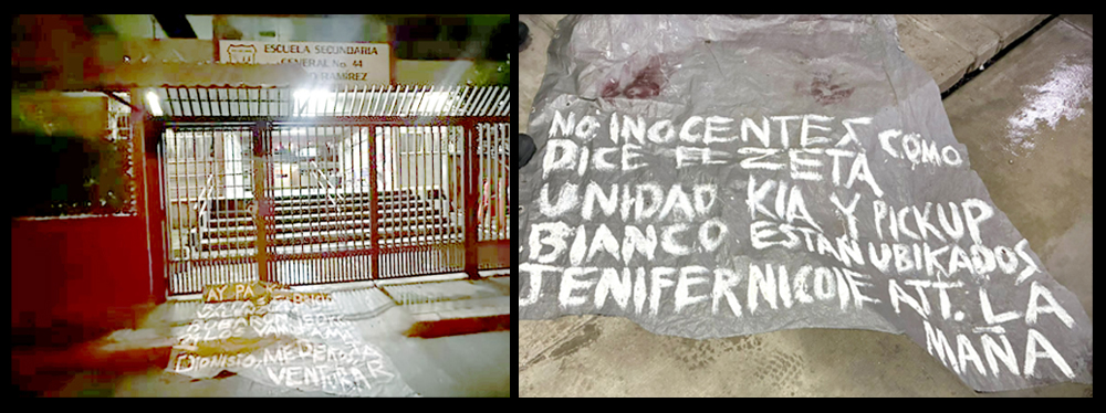 Pasadas las 00:20 horas del mismo miércoles, “dos masculinos con vestimenta negra y tenis blancos a bordo de una SUV” llegaron a la calle Cajeme, Colonia Cortez, Distrito La Mesa, en la puerta de la secundaria No. 44 Ignacio Ramírez, y extendieron en el cerco de la entrada principal una manta que traía dos mensajes distintos, uno en la parte frontal y otro en la posterior.