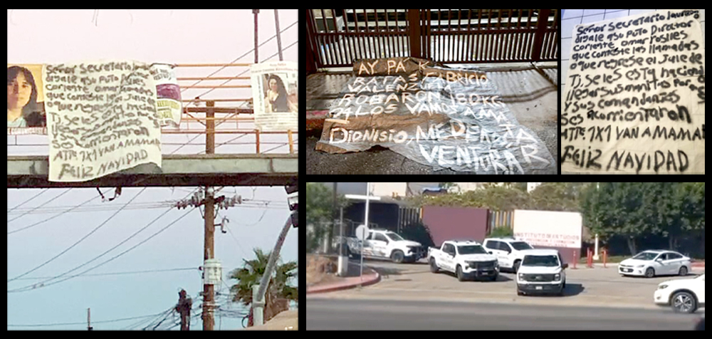 Luego, durante la madrugada del 15 de octubre en el puente peatonal ubicado entre calle novena y boulevard Lázaro Cárdenas en Mexicali, el mensaje de la manta fue: “Señor secretario dígale a ese puto director corriente omar Rosiles que conteste las llamadas o que regrese el jale de Tj se les está haciendo llegar su santito y sus comandantes (ilegible) se acorrientaron. Atte 1×1 van a mamar Feliz Navidad” [sic].