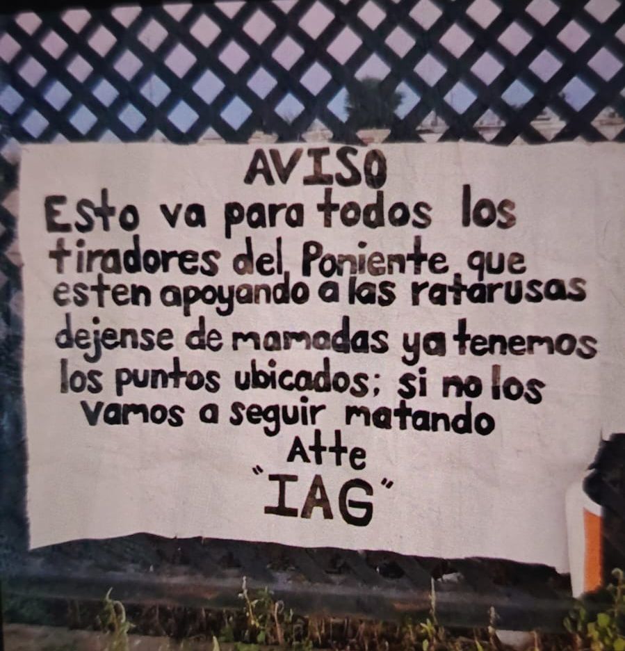 “El mensaje amenazante decía lo siguiente: AVISO Esto va para todos los tiradores del Poniente que estén apoyando a las ratarusas déjense de mamadas ya tenemos los puntos ubicados; sino los vamos a seguir matando Atte I.A.G”.