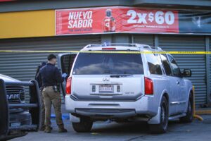 La policía acudió a la escena del crimen y paramédicos de Cruz Roja atendieron al lesionado que dijo ser el encargado de la tienda de autoservicio donde estaba estacionado sobre la calle Casuarinas de Riberas del Bosque