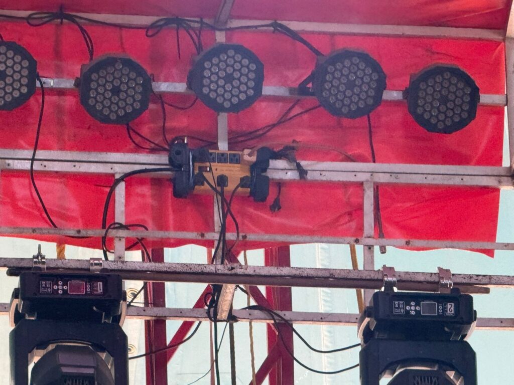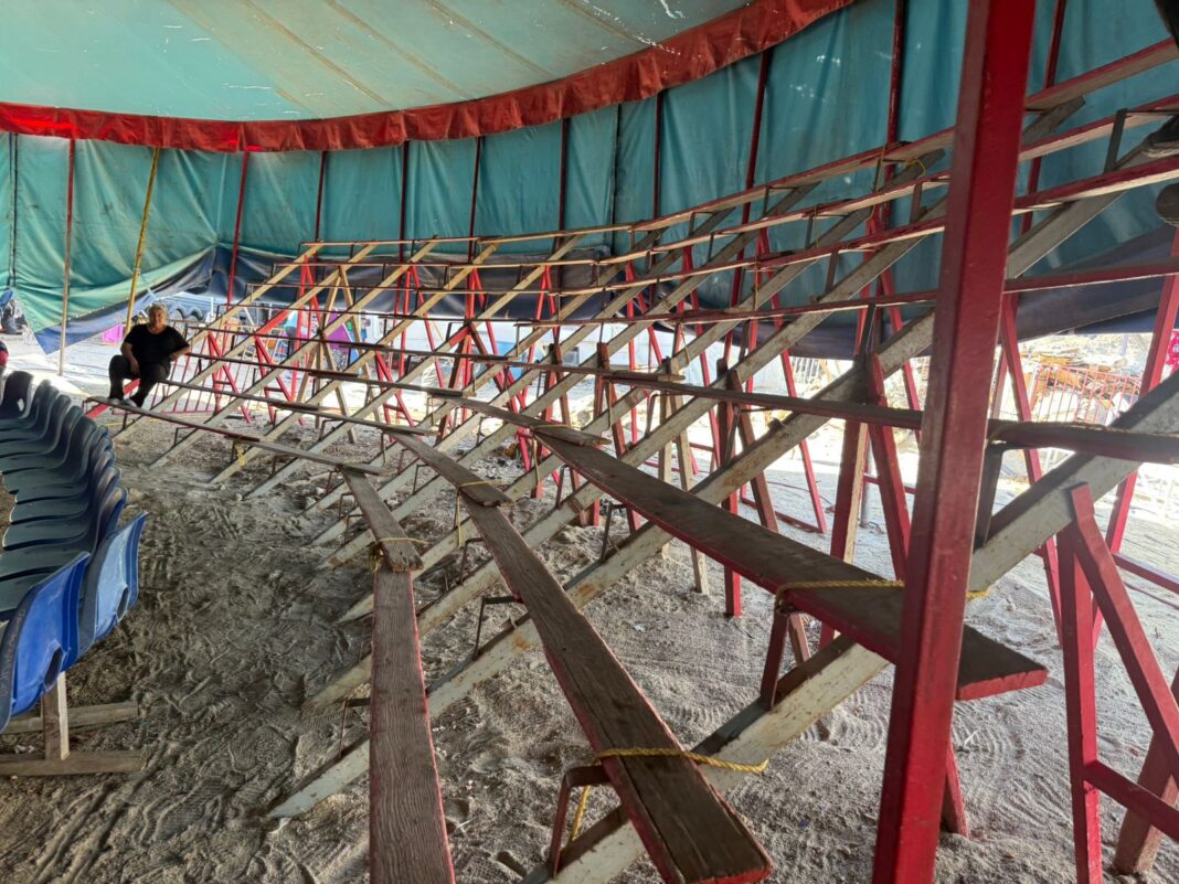 Entre las anomalías encontradas destacan: gradas con estructura alterada, donde se sustituyeron tubos metálicos por barrotes de madera sujetos con alambre, comprometiendo su estabilidad; tubulares dañados en la carpa; instalaciones eléctricas deficientes con cableado expuesto y conexiones inadecuadas para uso exterior, lo que representa riesgo de corto circuito.