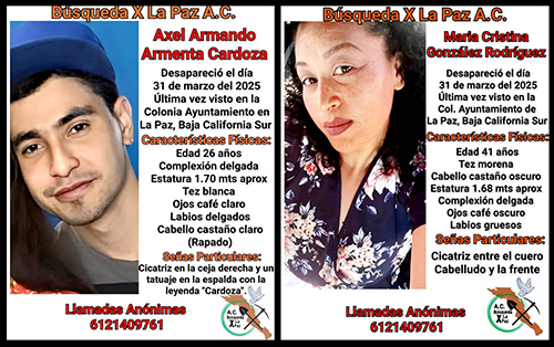 Las víctimas fueron identificadas como María Cristina González Rodríguez, de 41 años, y Axel Armando Armenta Cardoza, de 26, ambos privados de la libertad el 31 de marzo en la colonia Ayuntamiento, municipio de La Paz.