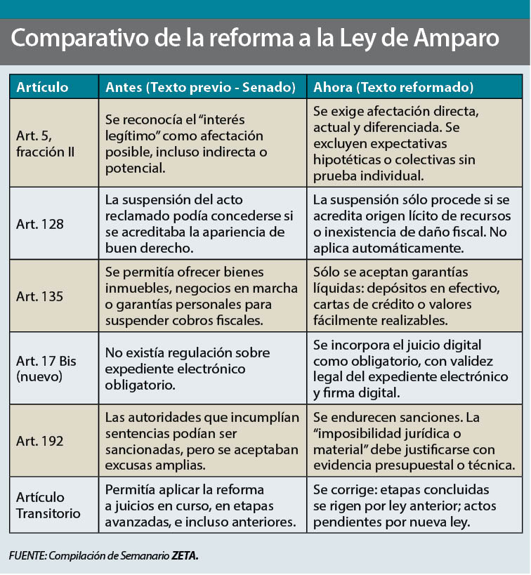 La reforma fue presentada como una modernización del sistema judicial, pero sus implicaciones van más allá de lo técnico. Redefine el concepto de interés legítimo, restringe la suspensión de actos reclamados, impone garantías fiscales líquidas, digitaliza el juicio de amparo y endurece las sanciones por incumplimiento. Todo ello en un contexto de creciente concentración de poder y debilitamiento de contrapesos institucionales, por lo que organizaciones civiles, académicos, empresarios y algunos legisladores han calificado la reforma como regresiva, autoritaria y lesiva para los derechos fundamentales.