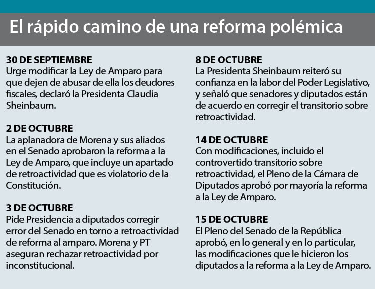 El Senado de la República aprobó el dictamen de reforma a la Ley de Amparo, previamente modificado por la Cámara de Diputados y fue ratificado sin cambios, en una sesión marcada por la dispensa de trámites, la exclusión del debate en comisiones y la polarización política. La minuta fue enviada de inmediato al Ejecutivo para su promulgación. En tanto, opositores y académicos estiman que la reforma rompe el equilibrio entre poder y ciudadanía y el juicio de amparo fue debilitado.