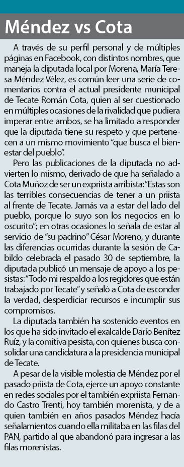 Una mancuerna se cocina en el Pueblo Mágico, y que tiene como objetivo principal el demeritar el trabajo que hasta este momento ha restado realizando el presidente municipal Román Cota Muñoz, señalan integrantes de la política en Tecate. En ésta participarían incluso integrantes de Morena (partido al que pertenece Cota Muñoz), como la actual diputada local por ese mismo partido, María Teresa Méndez, la regidora Reynalda Rodríguez y Dora Nidia Ruíz; del PAN, Laura Sevilla; los regidores del PES, Karolina Fraijo y Pedro Torres; el expresidente municipal Darío Benítez, también pesista; y el aún presidente del PES, César Hank Inzunza. Todos ellos habrían asistido a una asamblea en la que se presentó la proyección de un nuevo partido político que busca incrustarse en el estado.
