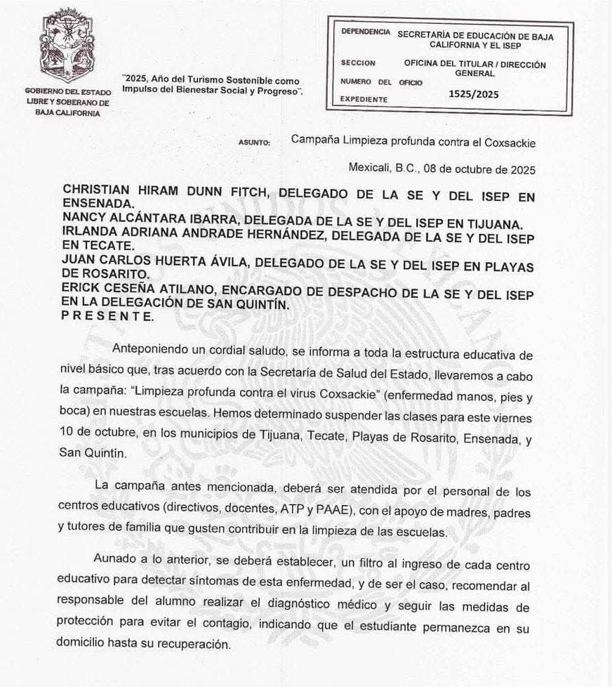 A través de una tarjeta informativa, la Secretaría de Educación de Baja California, informó que este viernes 10 de octubre suspenderán clases en todas las escuelas de nivel básico de cinco municipios, para realizar una limpieza debido a casos del virus coxsackie.