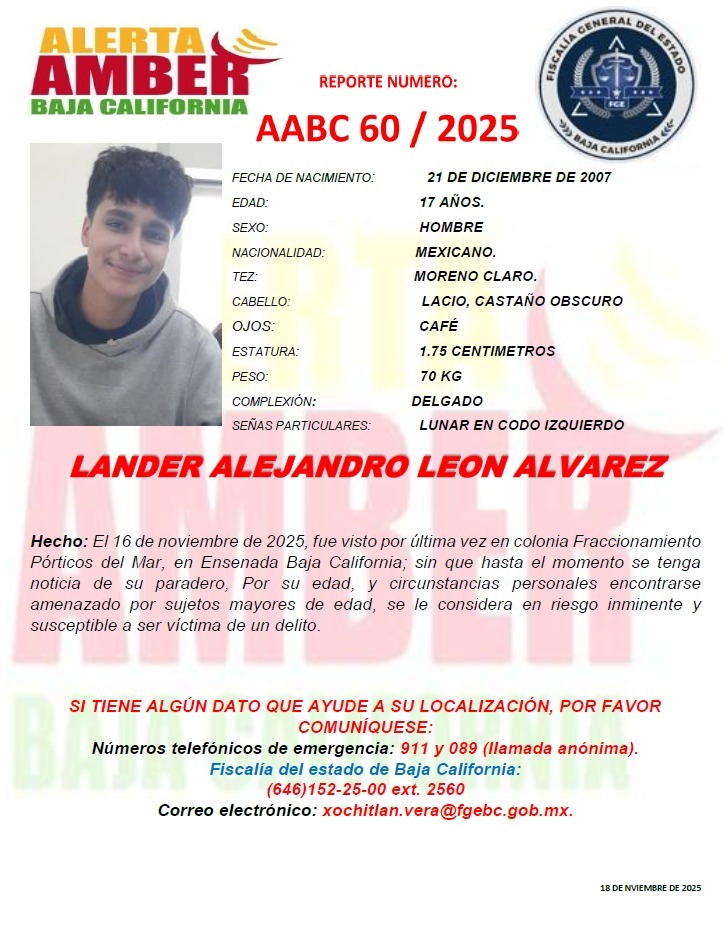 La Fiscalía General del Estado informó sobre la activación de la Alerta Amber para localizar a Lander Alejandro León Álvarez, de 17 años de edad.