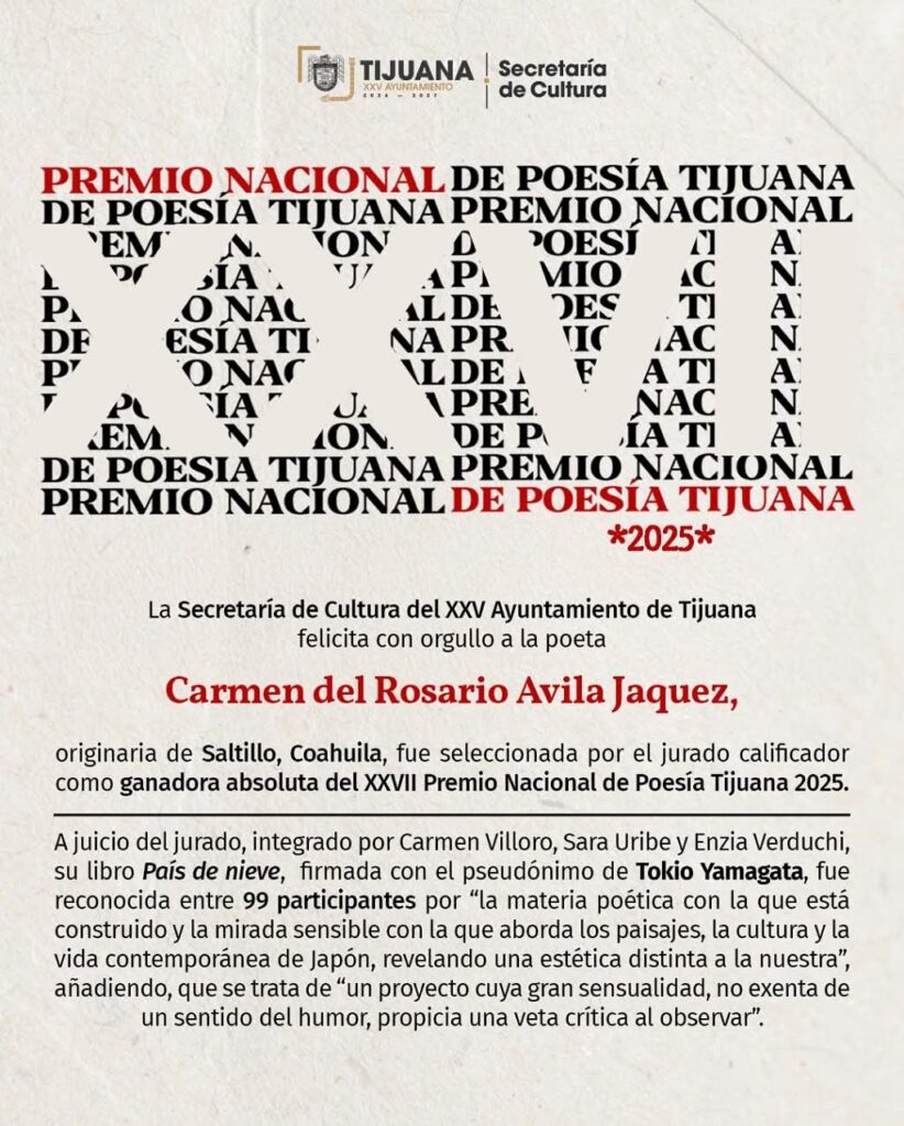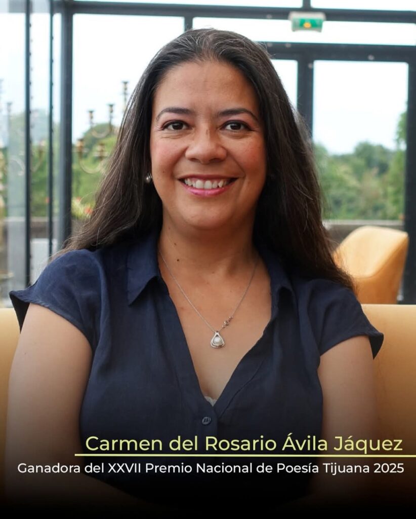 La escritora saltillense Carmen del Rosario Ávila Jáquez ganó el Premio Nacional de Poesía Tijuana 2025, en su edición XXVII, anunció este miércoles 5 de noviembre la Secretaría de Cultura de Tijuana, convocante del certamen literario fronterizo.