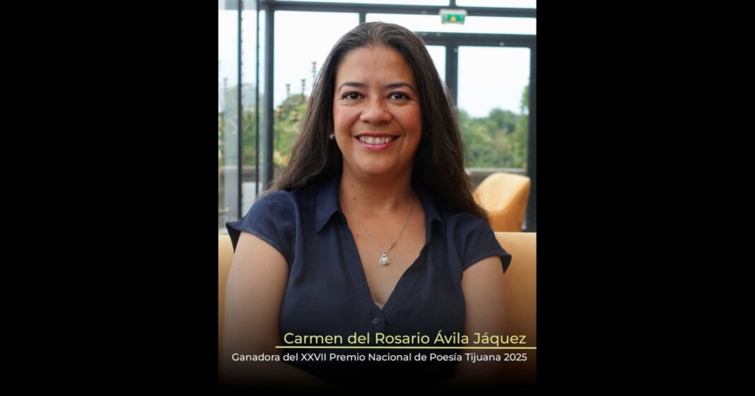 La escritora saltillense Carmen del Rosario Ávila Jáquez ganó el Premio Nacional de Poesía Tijuana 2025, en su edición XXVII, anunció este miércoles 5 de noviembre la Secretaría de Cultura de Tijuana, convocante del certamen literario fronterizo.