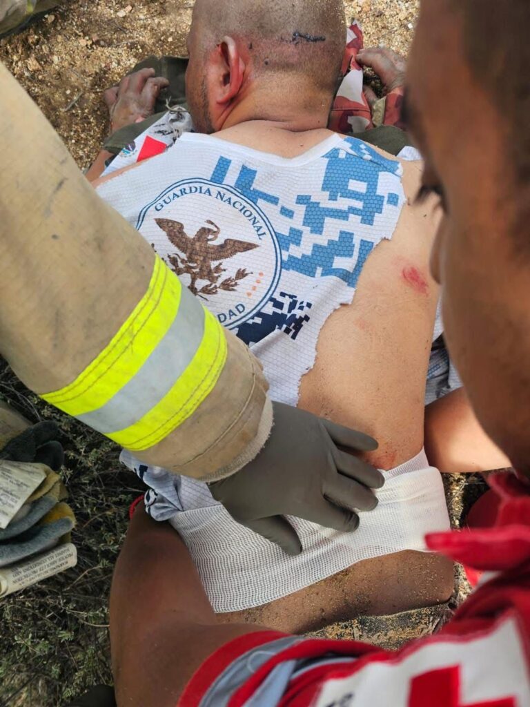 Paramédicos atendieron a dos lesionados por arma de fuego en el sitio: un elemento de la SEDENA, quien presentaba una herida en el abdomen, y un detenido que tenía un impacto de bala en un glúteo, además de quemaduras en diversas partes del cuerpo debido a que el vehículo en el que se transportaba fue incendiado mientras intentaba darse a la fuga.