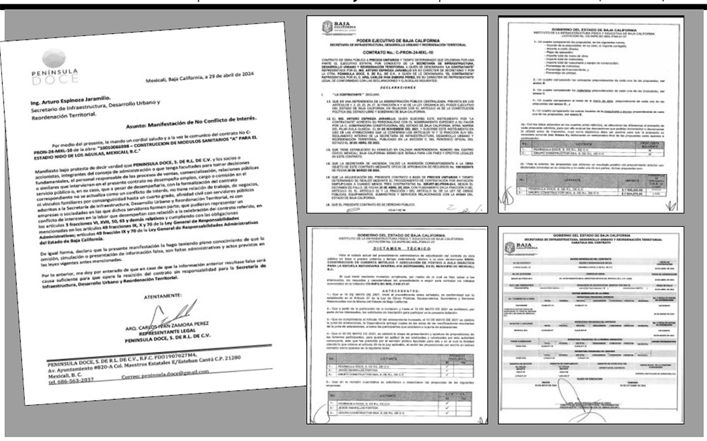 En ese mismo año, 2021, la empresa Grupo Constructor SEA, propiedad de Díaz Gutiérrez, compitió para obtener la “construcción de cubierta metálica y adecuación de pórtico de aula didáctica para la Escuela Secundaria General #16”, ubicada en Mexicali, donde fue invitada junto a otras dos empresas para presentar sus proyectos.