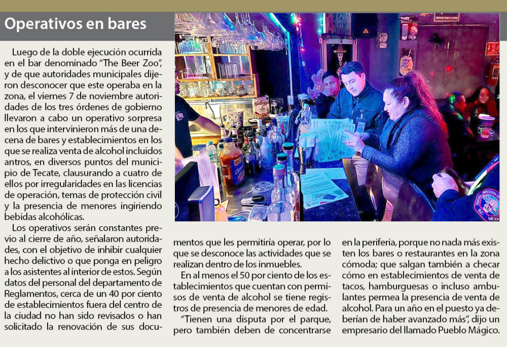 La revisión y detalles de la operatividad del inmueble se realizó como parte de la investigación de la ejecución de dos personas al interior del bar, ocurrida la noche del 31 de octubre en el establecimiento ubicado en las inmediaciones de la colonia Rincón Tecate. Se trató de un hombre y una mujer, identificados por los investigadores como Alejandro Castañeada, el Cando y/o “Durango”, y Gloria Catalina Antonio Flores, de 36 años.