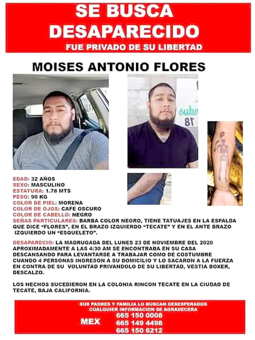 Otro de los hermanos de la ahora occisa fue reportado como desaparecido el 23 de noviembre del 2020; se trata de Moisés Antonio Flores, de entonces 32 años, quien fue privado de la libertad esa madrugada por un comando armado de cuatro sujetos, quienes irrumpieron en la vivienda ubicada en el rincón Tecate, en la misma área del bar donde fueron ejecutados Catalina, y el Cando, para obligarlo a subir a un automóvil descalzo y en bóxer para después darse a la fuga con rumbo desconocido. Hasta la fecha se desconoce su paradero.