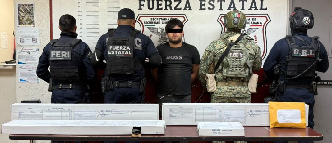 El hombre fue detenido e identificado como Williams “N”, de 27 años de edad, originario de Mexicali. Tras su captura, se inspeccionó la unidad, localizando un fusil calibre .223 milímetros, un revólver calibre .32 milímetros, 16 cargadores, 210 cartuchos útiles de diversos calibres y 20 cigarrillos electrónicos con extracto de THC.