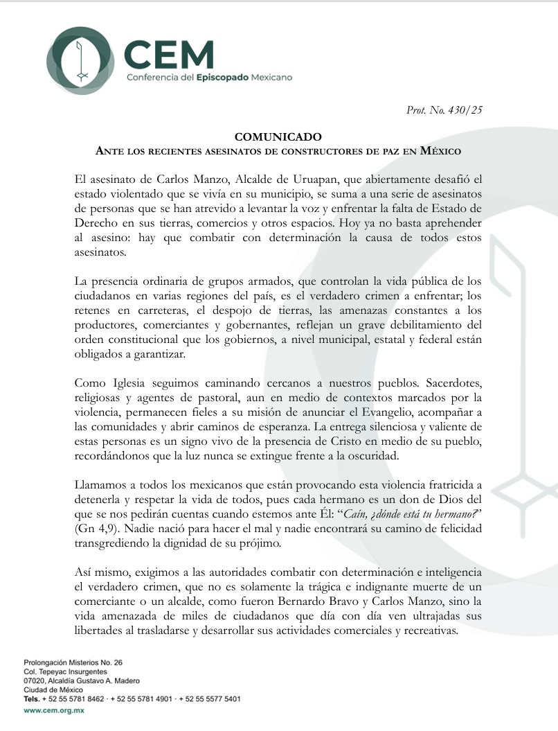 Firmado por don Ramón Castro Castro, presidente del Episcopado Mexicano (CEM), es un comunicado del domingo 2 de noviembre, donde los obispos mencionan a los líderes michoacanos, Bernardo Bravo y Carlos Manzo, a quienes el crimen organizado les arrebató la vida injustamente.