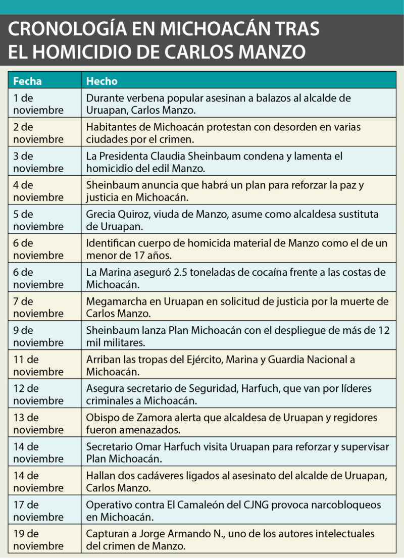 Hace más de tres semanas del homicidio del alcalde de Uruapan, Carlos Manzo Rodríguez, que desató otra crisis política y de seguridad en el estado de Michoacán, y aunque el crimen no ha sido esclarecido en su motivación, ya hay un presunto autor intelectual detenido por otros tres que han sido victimados. En tanto, el territorio michoacano recibió la presencia de tropas militares que refuerzan con más de 12 mil 500 elementos las tareas de contener la violencia y detener a objetivos prioritarios que la generan, como parte del plan de paz y justicia ordenado por la Presidenta Claudia Sheinbaum.