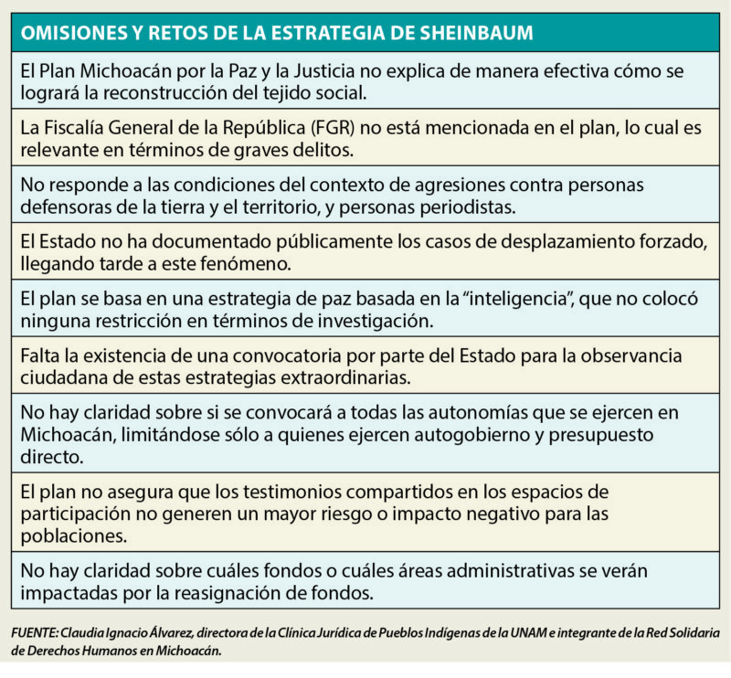 La directora de la Clínica Jurídica de Pueblos Indígenas de la UNAM e integrante de la Red Solidaria de Derechos Humanos en Michoacán, Claudia Ignacio Álvarez, analizó la información que las autoridades federales hicieron pública, sobre todo con gran interés, los apartados que corresponden a seguridad y a pueblos indígenas. Su diagnóstico es incisivo: a pesar de los 12 ejes que componen el plan, la estrategia no parece responder a las “condiciones del contexto que observamos desde Michoacán, un contexto donde persisten las agresiones contra personas defensoras de la tierra y el territorio y un clamor constante de justicia”.