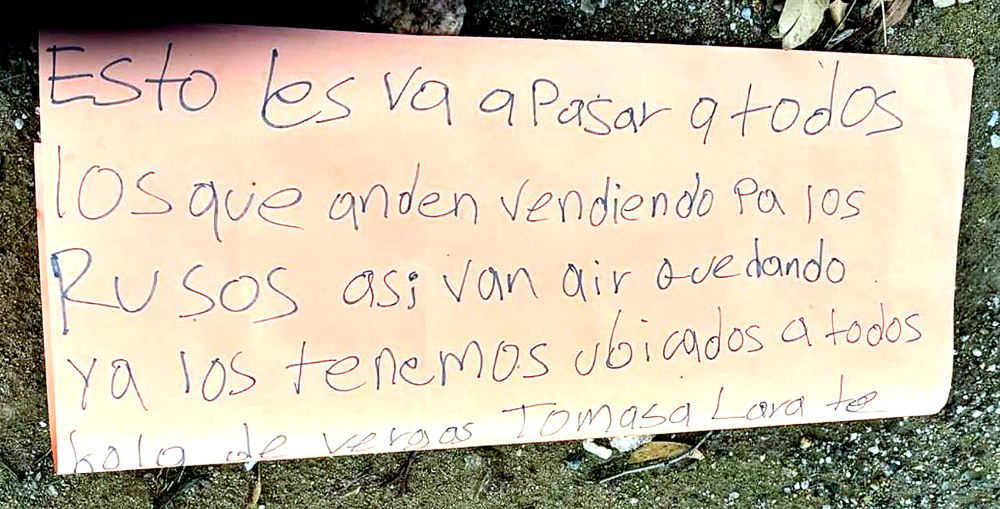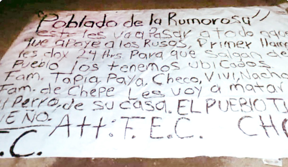 Lonas firmadas con las iniciales “F.E.C.” y que autoridades señalan como significado Fuerzas Especiales de La Chapiza, han sido colocadas a lo largo y ancho del poblado de la Rumorosa y colonias vecinas cercanas, en las que se advierte que serán asesinados quienes vendan, operen o apoyen a “los rusos”; e incluso las familias que tengan un perro, éste será ejecutado: