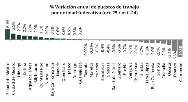 Estado de México, Ciudad de México e Hidalgo fueron las entidades que registraron mayor creación de empleos. En contraste, 18 entidades reportaron pérdidas en su variación anual, siendo Campeche (-10.3%) la que tuvo la caída más importante. En el caso de Baja California, el IMSS reporta un descenso anual de -2.0% al cierre de octubre.