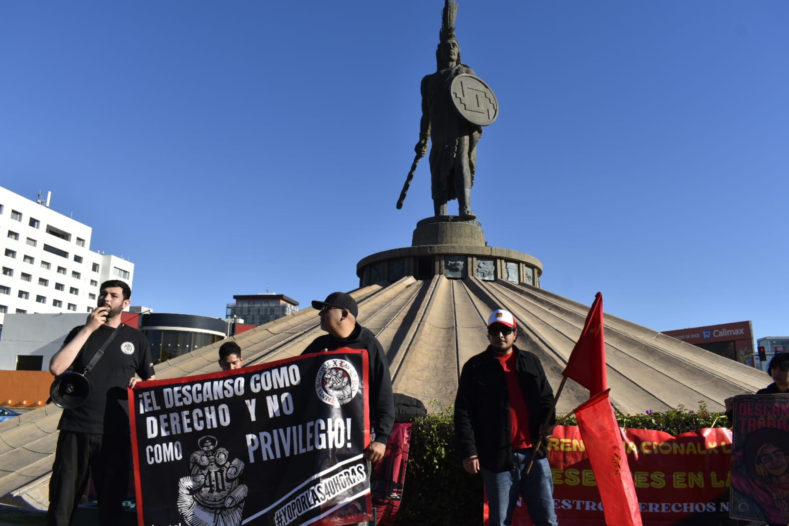 “El descanso como derecho y no como privilegio”, consignaron los participantes en una de las pancartas con las que acompañaron el acto de protesta celebrado en la glorieta Cuauhtémoc, sobre bulevar Cuauhtémoc y Paseo de los Héroes.