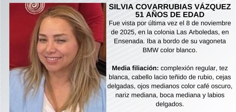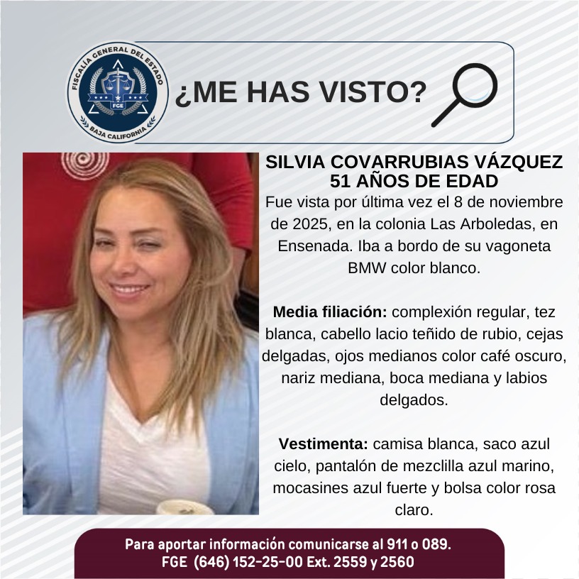 La Fiscalía General del Estado solicitó la colaboración de la ciudadanía para localizar a Silvia Covarrubias Vázquez, de 51 años de edad, quien fue vista por última vez el 8 de noviembre de 2025, en la colonia Las Arboledas, en Ensenada. Iba a bordo de su vagoneta BMW color blanco.