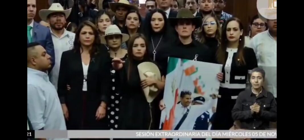 “México se está desangrando mientras los gobiernos se cambian de color para seguir gobernando”, expresó el legislador local, con integrantes del Cabildo de Manzo Rodríguez detrás.