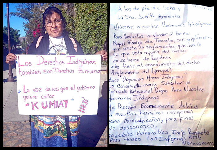 A través de un escrito a mano, Norma Meza advirtió que se lleva a la comunidad indígena al Parque Miguel Hidalgo, sin explicarles que existe un reglamento que regula el lugar, el cual la propia Judith Armenta aprobó en su tiempo como regidora, se lee en el documento. Al final del escrito, propone la creación de un Mercado Artesanal digno, y destinado únicamente a actividades de quienes realmente se dedican a realizar artesanías.