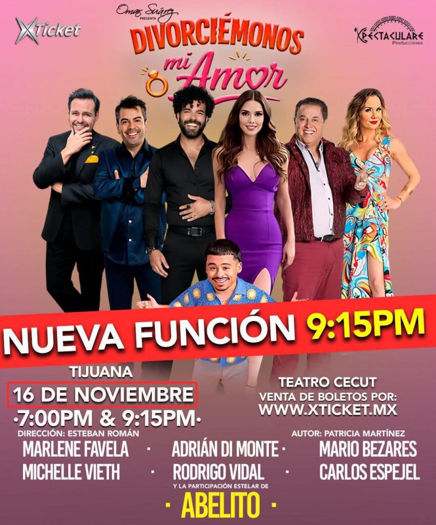 “Divorciémonos mi Amor”, que es una comedia llena de enredos, celos y risas que te hará reflexionar es protagonizada por Marlene Favela, Mario Bezares, Michelle Vieth, Rodrigo Vidal, Carlos Espejel y Abelito.
