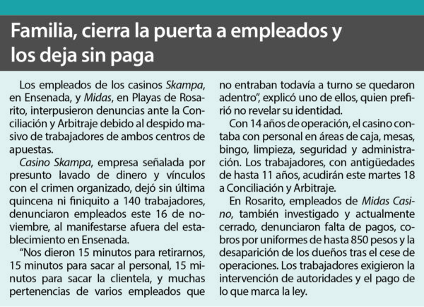 El miércoles 12 de noviembre, empleados del Casino Skampa y del restaurante Ochuna, en Ensenada, así como de su homónimo ubicado dentro del Midas Casino, en Playas de Rosarito, fueron evacuados por personal de la Secretaría de Gobernación como parte de una redada nacional destinada a clausurar 13 centros de apuestas considerados irregulares.