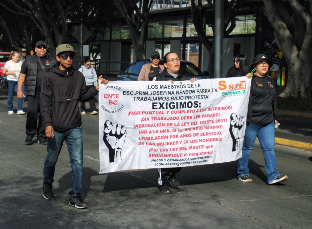Más de 100 maestros del Comité Democrático de la Coordinadora Nacional de Trabajadores de la Educación de Baja California (CNTEBC) se sumaron este jueves 13 de noviembre al paro nacional de 48 horas, realizando una marcha sobre Paseo Centenario en la Zona Río de Tijuana, para presionar y reanudar el diálogo con el Gobierno Federal, con el fin de resolver sus exigencias, como los pagos pendientes a docentes interinos del sistema educativo federal y la abrogación de la Ley del ISSSTE de 2007.