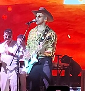 El espigado cantante lucio un pantalón oscuro y un saco blanco portando una texana y haciéndose acompañar por una decena de músicos mientras portaba su guitarra.