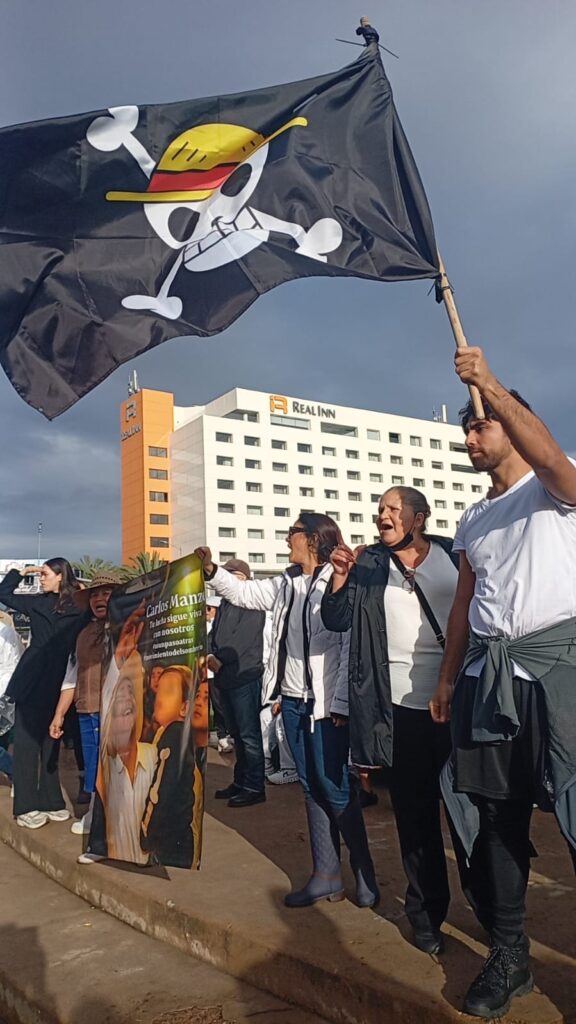 Entre vítores y silbidos, los más de 100 asistentes gritaban consignas y agitaban la bandera de México, pero también la del anime japonés One Piece, que se ha convertido en el símbolo de protesta a nivel mundial contra los “malos gobiernos”, permaneciendo en el monumento, para después, a eso de las 04:20 arrancar la marcha hacia el monumento México, más conocido como las Tijeras, y de ahí, dirigirse rumbo a Palacio Municipal, el cual estaba custodiado desde dentro con agentes de la Policía Municipal donde gritaron “Asesino”, “Él no murió, el gobierno lo mató”, en alusión al homicidio del presidente municipal de Uruapan.