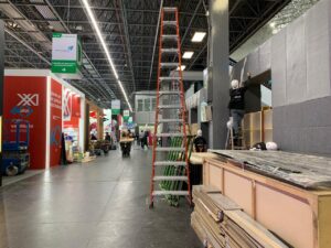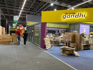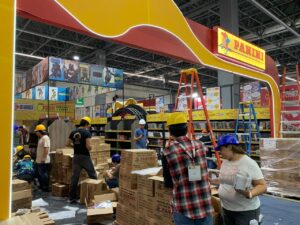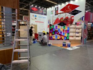 Centenares de trabajadores, entre ellos muchas mujeres, laboran arduamente colocando mamparas, techos, luminarias, alfombras y postes para que los módulos de las librerías luzcan en todo su esplendor.