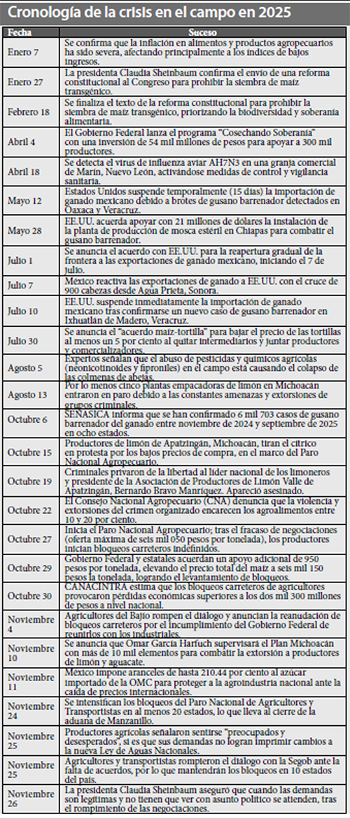 El panorama más reciente, que sirve como punto de partida para este análisis, es la ruptura total del diálogo. La noche del 25 de noviembre y la madrugada del 26 de noviembre de 2025, agricultores y transportistas se levantaron de la mesa de negociación con la Secretaría de Gobernación (Segob), declarando la falta de acuerdos satisfactorios y el mantenimiento de los bloqueos en al menos 10 estados del país.