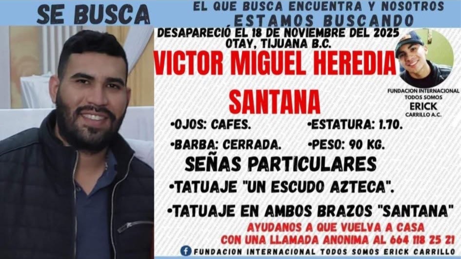 El Colectivo Todos Somos Erick Carrillo realiza una jornada de búsqueda este jueves 4 de diciembre en la colonia 10 de mayo de Tijuana, en apoyo a familiares de Víctor Miguel Heredia Santana, de 33 años, quien permanece desaparecido junto a otras tres personas desde el pasado 19 de noviembre.