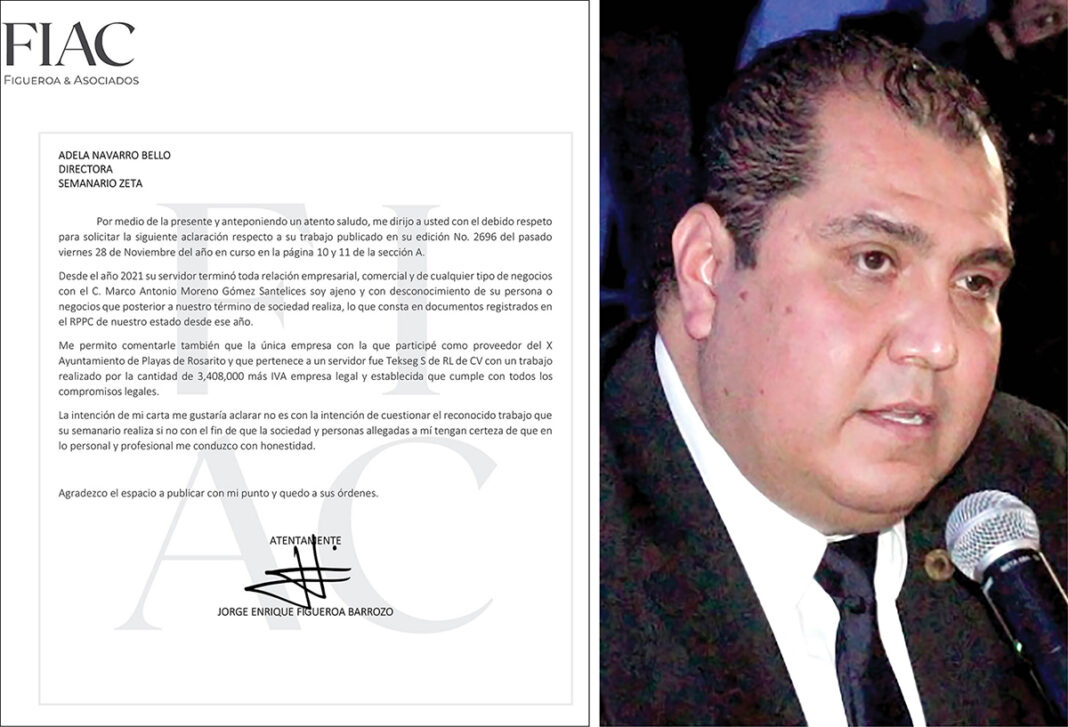 Por estos días en que resulta cada vez más importante conocer el entorno y los antecedentes de las personas con quienes se asocian, a propósito de las redes de lavado de dinero que el Departamento del Tesoro de los Estados Unidos está detectando, investigando y sancionando a través de la OFAC (Oficina de Control de Activos Extranjeros, por sus siglas en inglés), otro empresario ha salido a pintar su raya en relación a uno de los favoritos de los gobiernos de Morena en Baja California. El deslinde lo hace Jorge Enrique Figueroa Barrozo, en relación al favorecido por Estado, Fiscalía y Municipio, Marco Antonio Moreno Gómez Santelices, con quien no desea que se le asocie dado que su relación de negocios concluyó hace algunos años. En una carta que envió a ZETA, Figueroa Barrozo aclara: “Por medio de la presente y anteponiendo un atento saludo, me dirijo a usted con el debido respeto para solicitar la siguiente aclaración respecto a su trabajo publicado en su edición No. 2696 del pasado viernes 28 de noviembre del año en curso en la página 10 y 11 de la sección A. Desde el año 2021 su servidor terminó toda relación empresarial, comercial y de cualquier tipo de negocios con el C. Marco Antonio Moreno Gómez Santelices; soy ajeno y con desconocimiento de su persona o negocios que posterior a nuestro término de sociedad realiza, lo que consta en documentos registrados en el RPPC de nuestro estado desde ese año. Me permito comentarle también que la única empresa con la que participé como proveedor del X Ayuntamiento de Playas de Rosarito, y que pertenece a un servidor, fue Tekseg S. de R.L. de C.V., con un trabajo realizado por la cantidad de 3,408,000 (tres millones cuatrocientos ocho mil pesos) más IVA, empresa legal y establecida que cumple con todos los compromisos legales. La intención de mi carta me gustaría aclarar (que) no es con la intención de cuestionar el reconocido trabajo que su Semanario realiza, sino con el fin de que la sociedad y personas allegadas a mí tengan certeza de que en lo personal y profesional me conduzco con honestidad. Agradezco el espacio a publicar con mi punto y quedo a sus órdenes”, y la firma de su puño y letra. Ahora sí que eso de hacer negocios con los gobiernos de Morena, a cuyos varios de sus representantes el gobierno de los Estados Unidos les ha retirado la visa de turista para internarse en aquel país, está resultando contraproducente. Eso, y ser señalados en una red de lavado de dinero por el Departamento del Tesoro.